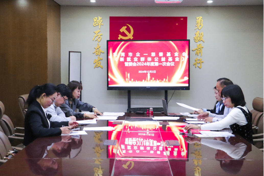 《新就业群体公益基金》管委会主席陈榆洁、执行主席谭军波、秘书长刘玉平,委员沈双、严琼芳出席会议,东莞市众一慈善基金会党支部书记、会长郑乃清列席参加。秘书长刘玉平主持会议。