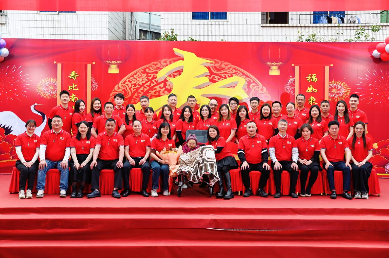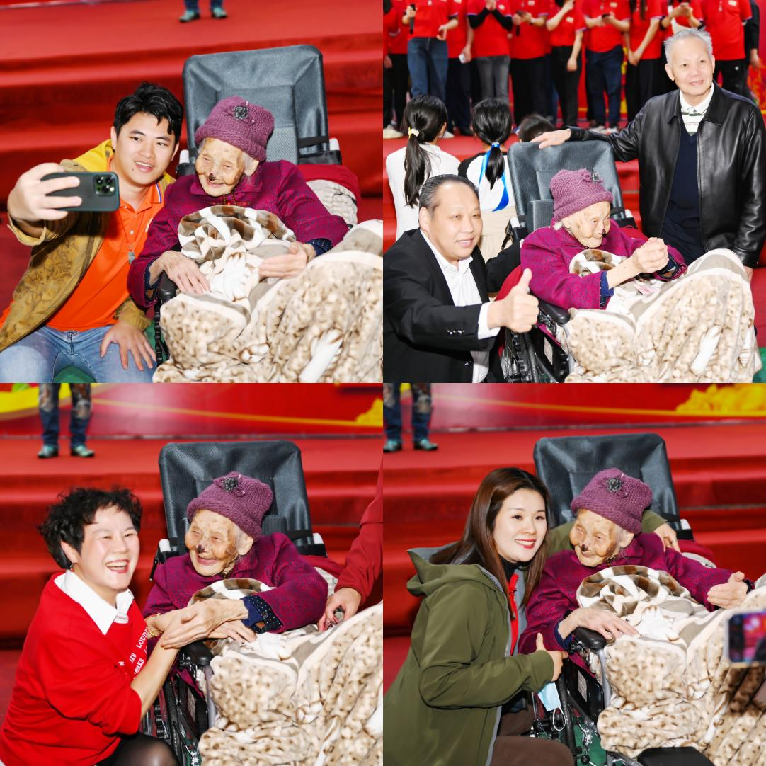 随后,老人在众星捧月下被簇拥到台前,孙子孙女们扶持着她亲手切下生日蛋糕,并逐一接受晚辈们的行礼、祝寿、献花,全场共同见证了这一阖家欢庆的美好时刻。东莞市众一慈善基金会也送上了祝福和慰问品,传递了社会对老人的关爱与敬意。